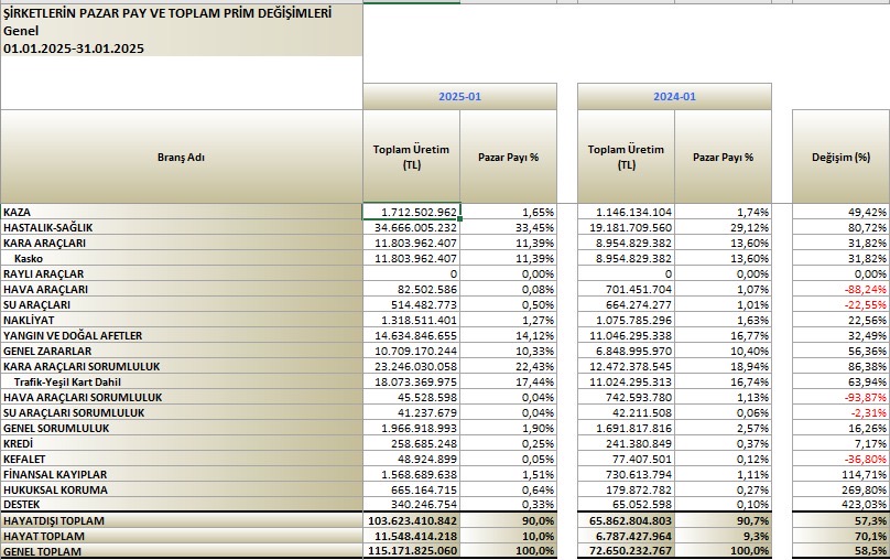 👉Hayat ve Hayat Dışı Olmak üzere Türk Sigorta Sektötünde Faaliyet gösteren Sigorta Şirketleri, 2025 Yılı Ocak ayında, bir önceki yıl aynı döneme göre %58 lik bir büyüme sağlayarak 115 Milyar Toplam Prim Üretimine Ulaştı.