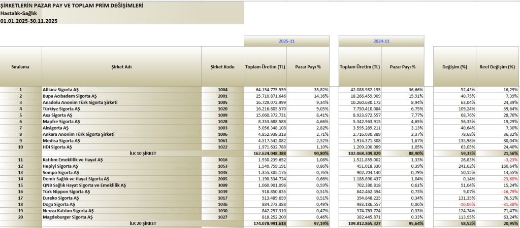 👉Türkiye Sigorta sağlık branşında, sektörün %55 ve reelde %19 büyüdüğü Kasım ayında %109 büyüme ve reelde %59 lık büyüme ile 16,2 milyar prim üretimi yaparak en fazla sağlık üretimi yapan 4. Şirket olmuştur.