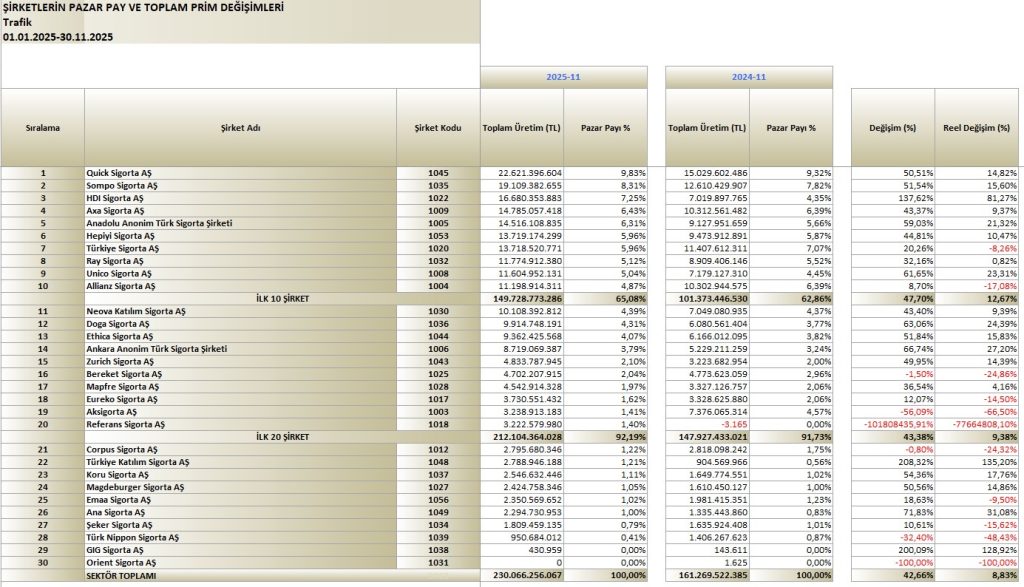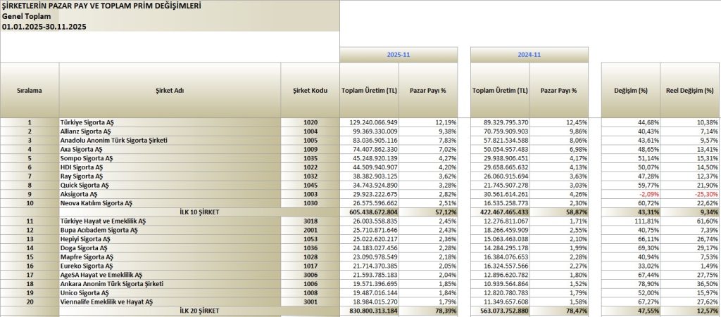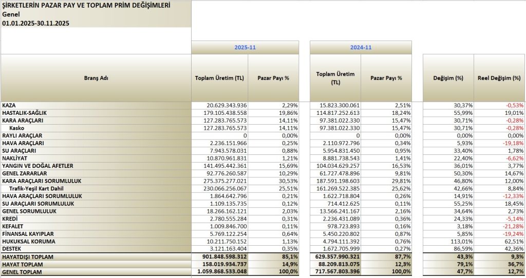 TSB (Türkiye Sigorta Birliği) Kasım 2025 İstatistikleri Belli Oldu.