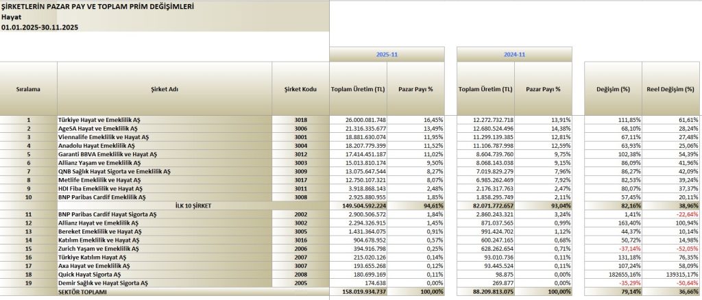🔹Hayat Dışı Toplam Prim 902 milyar olurken, hayat Şirketleri tarafından yılın 11 ayında 158 milyar prim üretimine ulaşılmıştır.